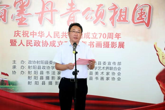 9月29日上午,射阳县庆祝新中国成立70周年暨人民政协成立70周年“翰墨丹青颂祖国”书画摄影展在县行政中心一楼大厅举行。活动由县委常委、宣传部长董光威主持,县政协主席邱德兵讲话,县文联主席徐必友介绍活动筹备情况。县政协主席会议成员、县委宣传部中层以上干部、县文联及各文艺家协会负责人与会员代表等共近百人参加开幕式。