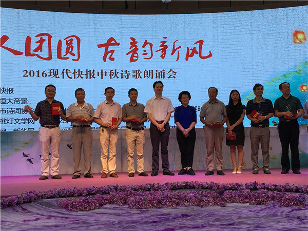 9月11日下午,由现代快报主办,盐城市诗词协会、盐城市书法家协会、盐都诗书画社、盐城“浠沧月—湖畔悦读公社”协办的“人团圆 古韵新风——2016中秋诗歌朗诵会”在盐城举行。盐城市广大诗歌朗诵爱好者齐聚一堂,或低吟浅唱,或雄浑高吭,抒发对祖国、生活的热爱。盐城市文联主席嵇绍乾,市政协文史委主任、市诗词协会主席徐于斌及部分团体负责人出席朗诵会。