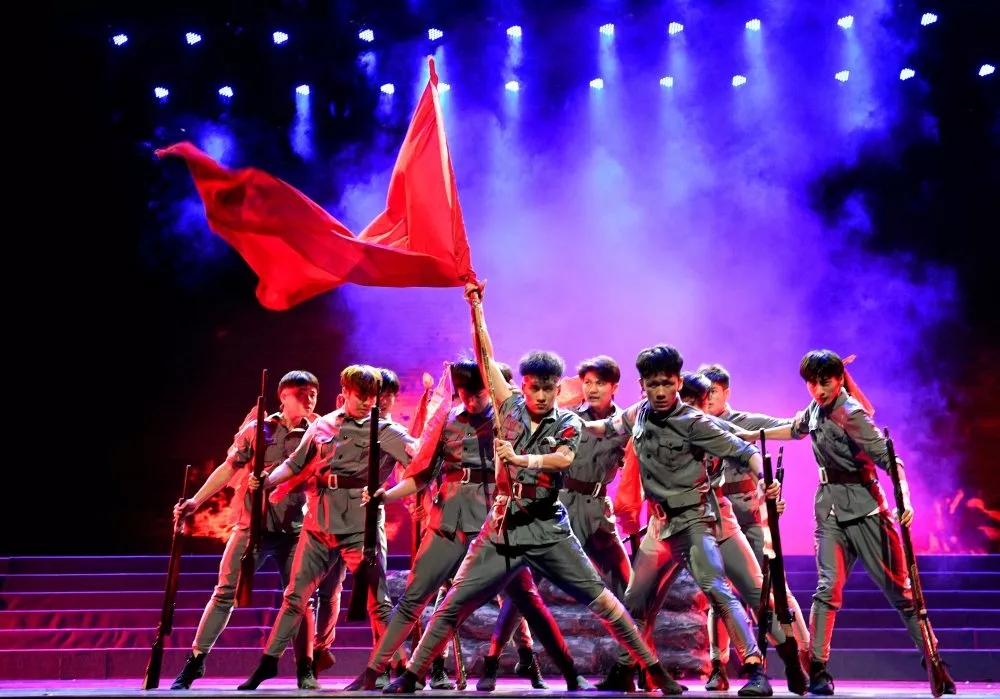 “盐南阻击战”中,通过舞蹈演员肢体性的语言,艺术化反映紧张惨烈的战斗场面,同时表现出五条岭烈士英勇的战斗形象和勇敢的战斗精神。