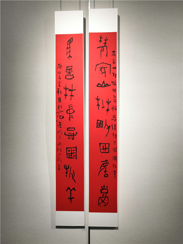 陈宇书法作品多取法摩崖石刻及钟鼎铭文,展现出一派“洪荒”之境,撼人心魄。近年又于隶、行、楷用功至深,用笔老道又灵动,具有天然的禅意、干净、雅逸。