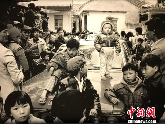 安哥作品。1988年3月,广东东莞麻涌大道通车后,第一台出租车被村民围得水泄不通。 胡健 摄