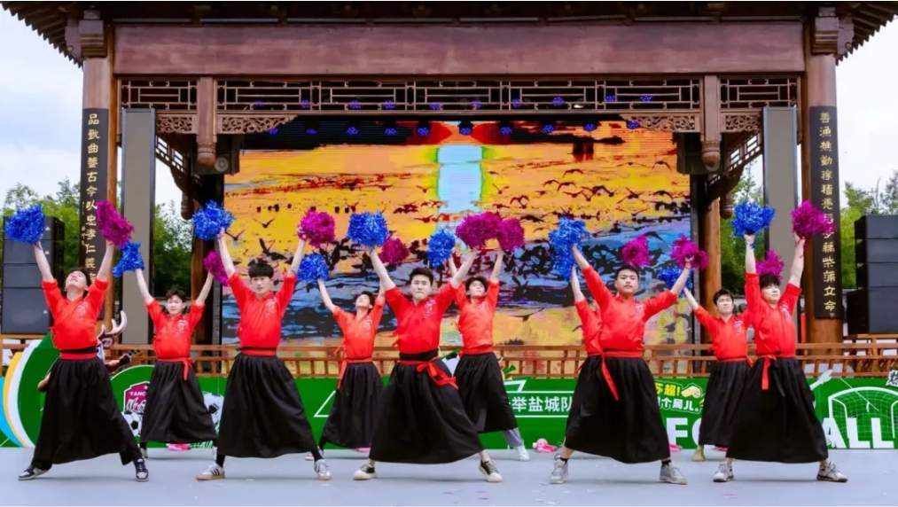 最后,由淮剧小镇创排、融合音乐、舞蹈、淮剧、杂技等多种艺术形式的音舞诗画《燃动盐城》,将现场气氛推向高潮,展现盐阜大地的千年文脉与时代活力的同时,为苏超足球联赛盐城队加油助威。