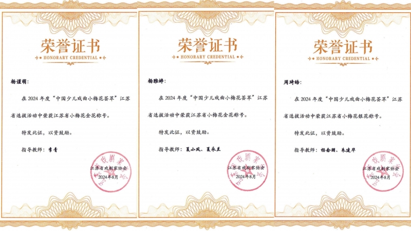 日前,由市戏剧家协会推荐参赛的杨谨萌、杨雅婷、周琦皓3名选手,在第28届“中国少儿戏曲小梅花荟萃”江苏选拔赛中脱颖而出,喜摘2朵金花、1朵银花,成绩喜人。其中,杨谨萌获江苏省小梅花金花(地方戏专业组),杨雅婷获江苏省小梅花金花(京昆业余组),周琦皓获江苏省小梅花银花(京昆业余组)。