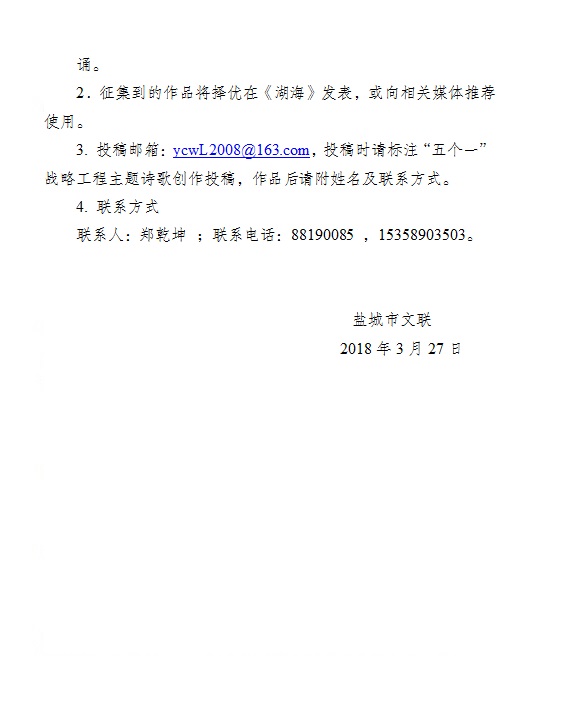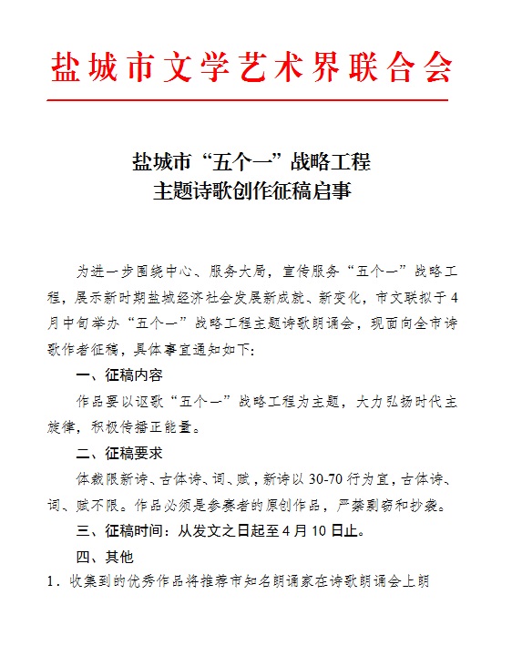 盐城市“五个一”战略工程 主题诗歌创作征稿启事